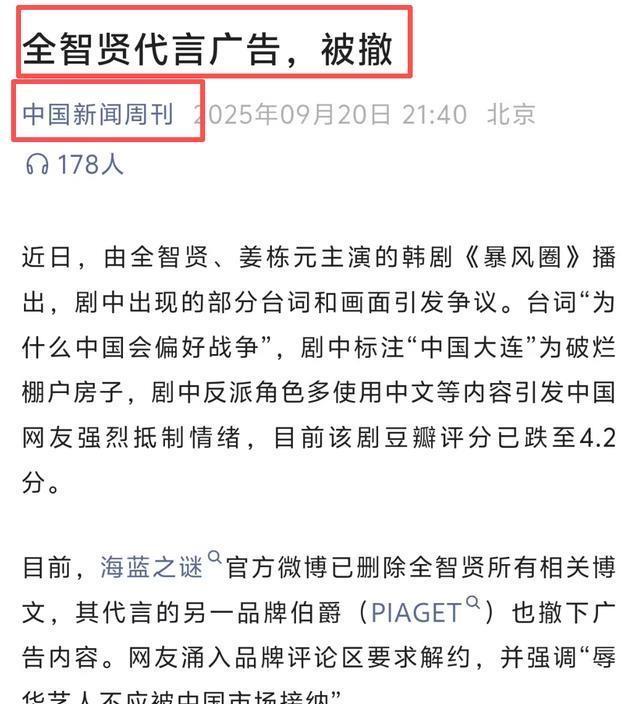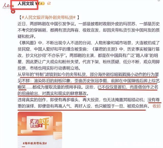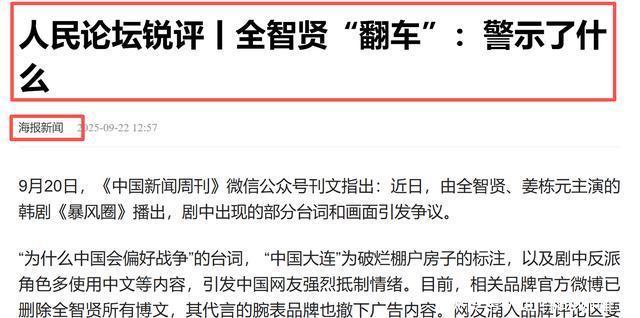 近日 《中国新闻周刊》发文点名全智贤相关事件。 其表示, 由全智贤主演的《暴风圈》部分台词和画面引发争议。 而此次点名的余温还未消退,人民文娱就再次出手。